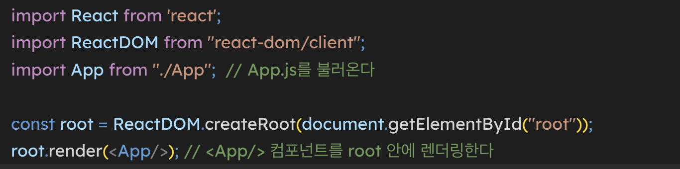 이곳에서 리액트가 렌더링 될 것이다. 다시 말하면 id = "root"인 <div> 안에 리액트 컴포넌트가 들어올 것!