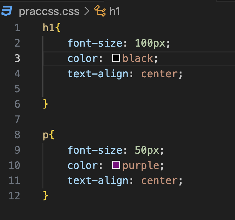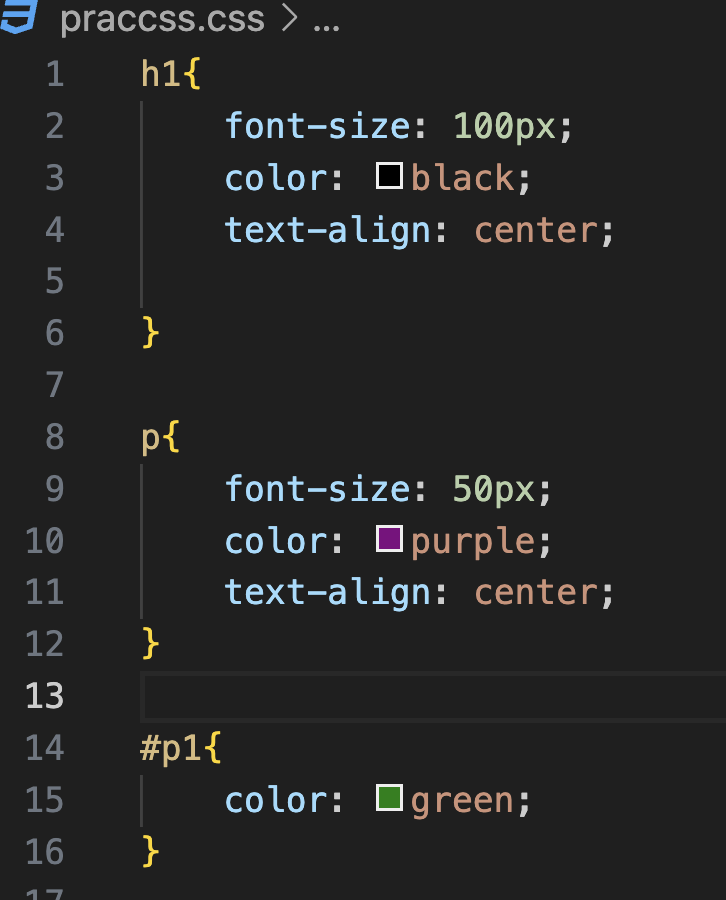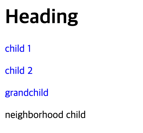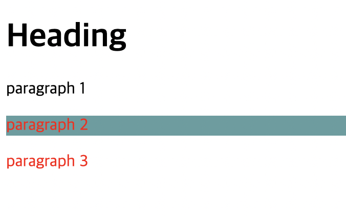 선택자: 앞에 css 파일에서 나온 h1과 p 같이 HTML에서 꾸며질 글씨 지정하는 역할을 함