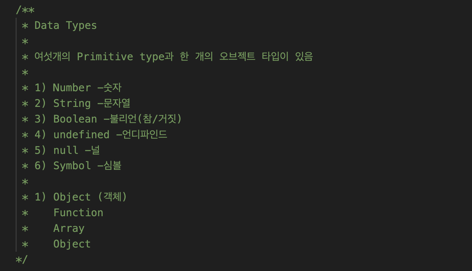 자바 스크립트는 총 7개의 데이터 타입으로 구성된다. (primitive 타입 6개 + object 타입 1개)