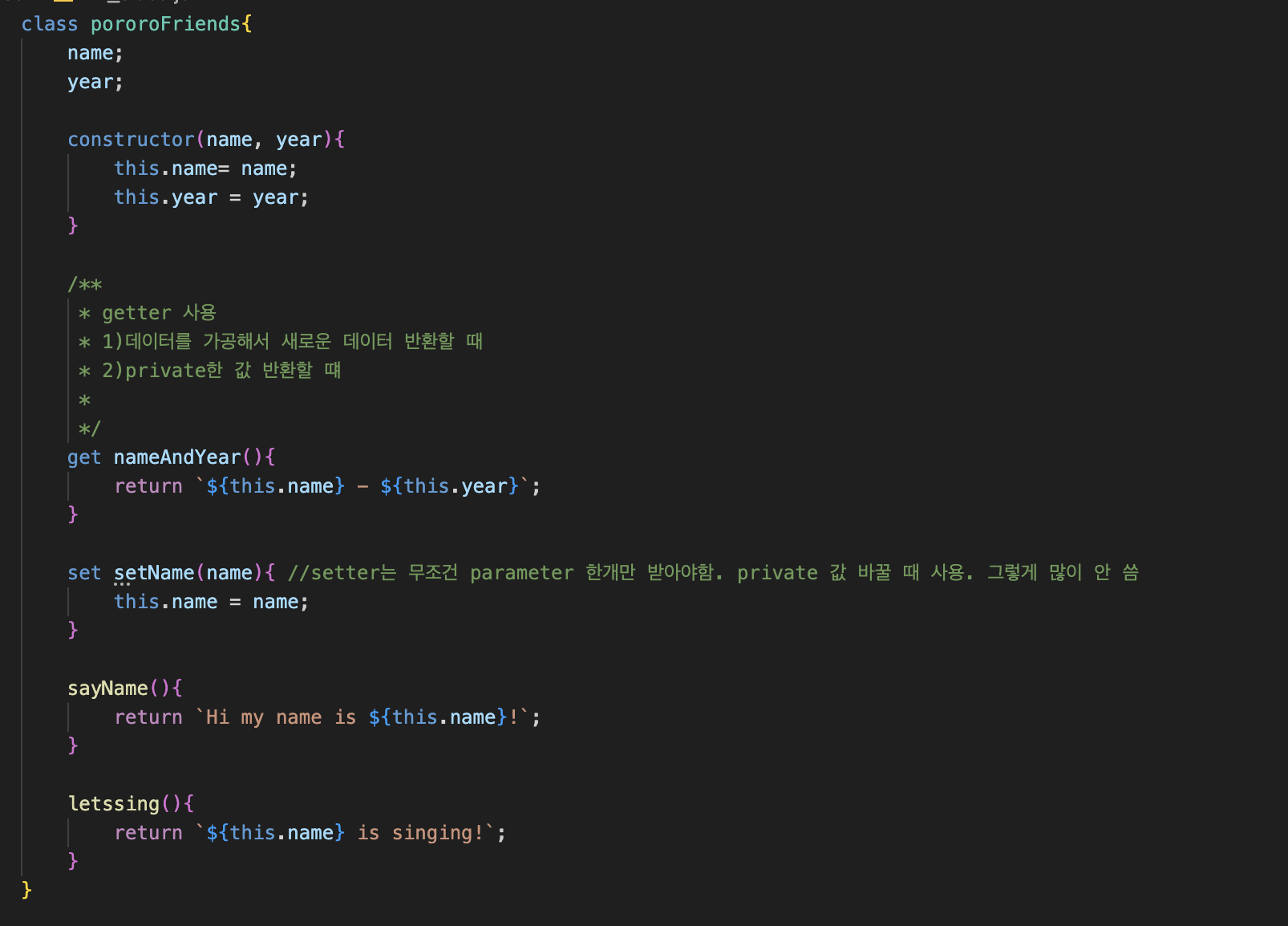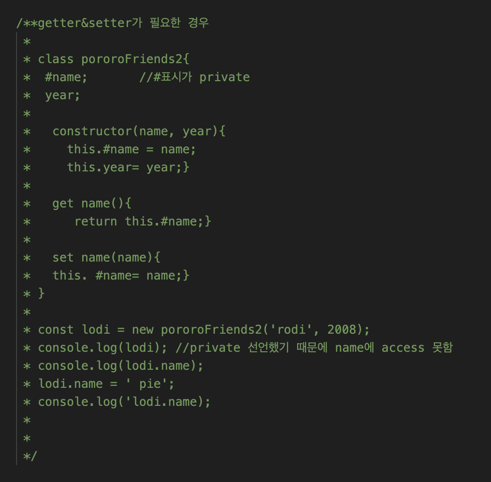 getter와 setter는 private한 변수에 접근할 때 필요하다. getter에 비해 setter는 자주 쓰이지 않는다.