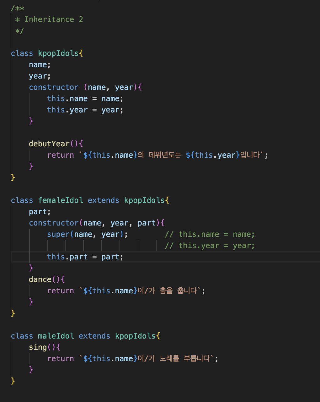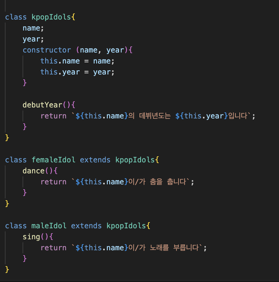 클래스에도 부모와 자식 관계가 형성된다. 자식이 부모의 재산을 상속받는 것처럼 클래스 사이에서도 가능하다. 현재 kpopIdols라는 클래스가 있다. 안에는 name과 year의 constructor가 있고 debutYear 이라는 메소드(함수)가 있다. 그 아래의 femaleIdol 클래스는 extends라는 키워드를 통해 kpopIdols의 name과 year, debutYear을 그대로 상속받을 수 있다. 즉 kpopIdols는 부모 클래스가, femaleIdol은 자식 클래스가 된 것이다.
