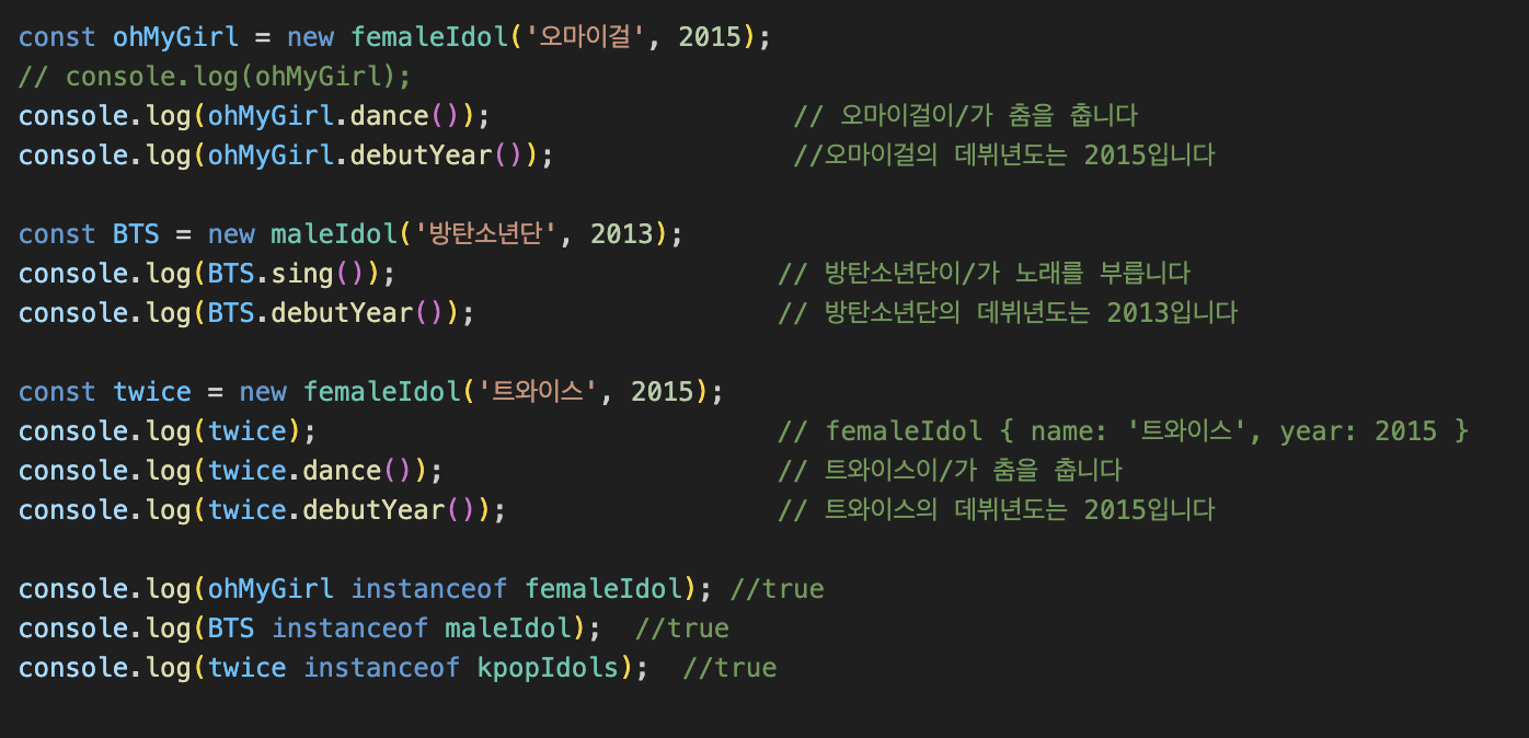 femaleIdol 클래스를 바탕으로 ohMyGirl이라는 객체가 만들어졌다. femaleIdol은 kpopIdols의 자식 클래스이기 때문에 debutYear이라는 메서드에 접근할 수 있고 이를 이용할 수 있다. 따라서 우리는 오마이걸의 데뷔년도를 프린트할 수 있다. 이는 BTS와 twice의 경우도 마찬가지이다. 이처럼 상속은 부모의 속성들을 자식도 이용가능케 하여 더 효율적인 코드를 짤 수 있도록 돕는다.